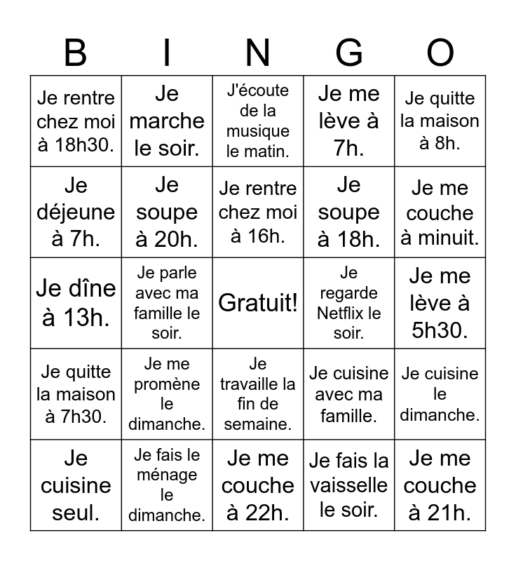 This bingo card has a free space and 34 words: Je me lève à 6h., Je fais la vaisselle le soir., Je me lève le samedi., Je me couche tôt., Je quitte la maison à 7h30., Je soupe à 20h., Je quitte la maison à 8h., Je cuisine seul., Je marche le soir., Je regarde la télé le soir., Je rentre chez moi à 16h., J'écoute de la musique le matin., Je ne déjeune pas., Je me lève à 11h le dimanche., Je regarde Netflix le soir., Je me couche à minuit., Je fais le ménage le dimanche., Je dîne à 13h., Je me promène le dimanche., Je cuisine avec ma famille., Je travaille la fin de semaine., Je relaxe le samedi., Je rentre chez moi à 18h30., Je me lève à 5h30., Je me couche à 22h., Je me couche à 21h., Je me lève à 7h., Je soupe à 19h., Je soupe à 18h., Je déjeune à 7h., Je mange une collation l'après-midi., Je parle avec ma famille le soir., Je cuisine le dimanche. and Je me lève à 12h le week-end..
