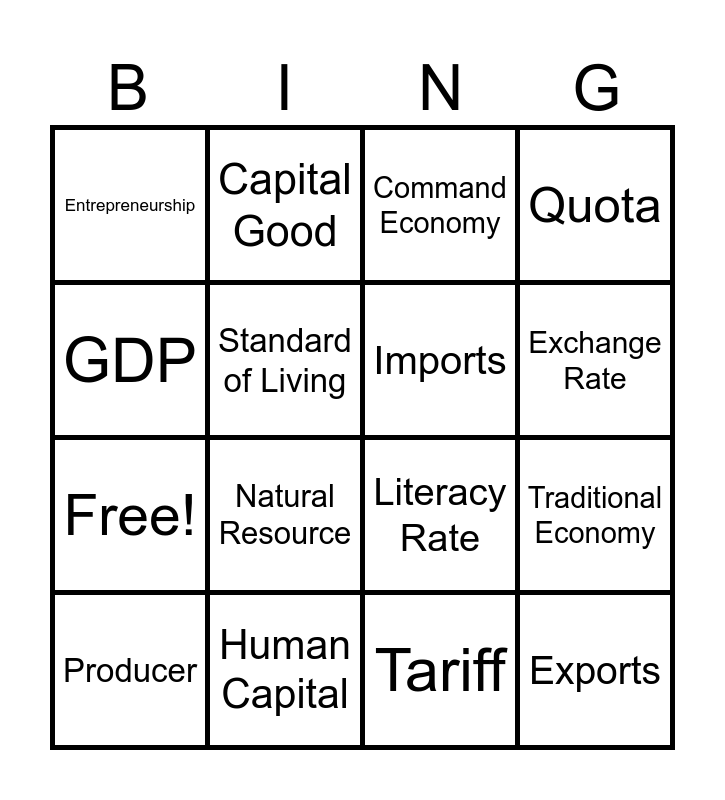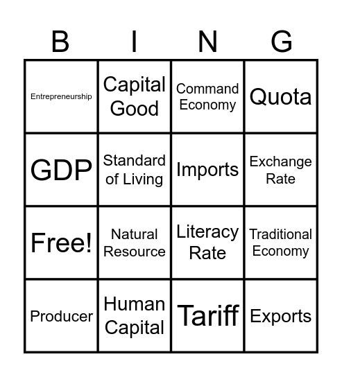 This bingo card has 20 words: Traditional Economy, Market Economy, Command Economy, Consumer, Producer, GDP, Human Capital, Entrepreneurship, Free!, Capital Good, Natural Resource, Literacy Rate, Standard of Living, Exports, Imports, Trade, Exchange Rate, Quota, Tariff and Embargo.