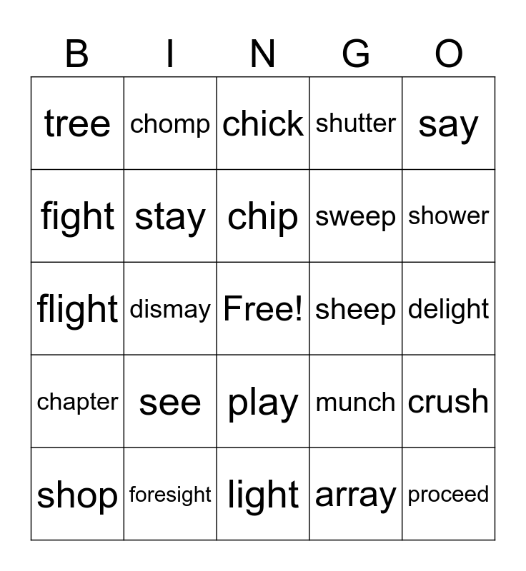 This bingo card has a free space and 25 words: see, light, chip, shop, say, tree, fight, chomp, sheep, play, sweep, flight, munch, crush, stay, cheese, delight, chick, shower, dismay, proceed, foresight, chapter, shutter and array.