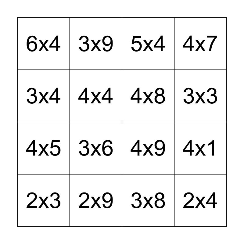 This bingo card has a free space and 15 words: 2x3, 2x4, 5x4, 6x4, 3x3, 3x4, 3x6, 3x8, 4x4, 4x5, 4x1, 4x7, 4x8, 3x9 and 2x9.