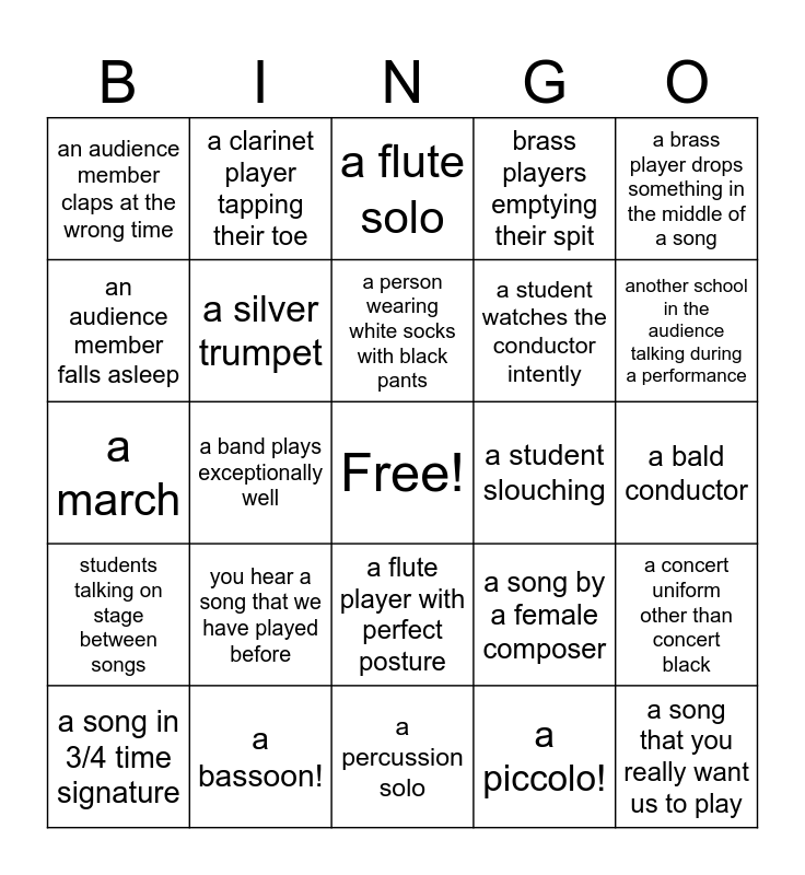 This bingo card has a free space and 24 words: you hear a song that we have played before, a bassoon!, a person wearing white socks with black pants, a song in 3/4 time signature, a brass player drops something in the middle of a song, an audience member claps at the wrong time, an audience member falls asleep, a clarinet player tapping their toe, a student slouching, a flute player with perfect posture, a student watches the conductor intently, a march, a song by a female composer, a concert uniform other than concert black, a silver trumpet, a piccolo!, a bald conductor, a flute solo, another school in the audience talking during a performance, a band plays exceptionally well, a song that you really want us to play, students talking on stage between songs, brass players emptying their spit and a percussion solo.