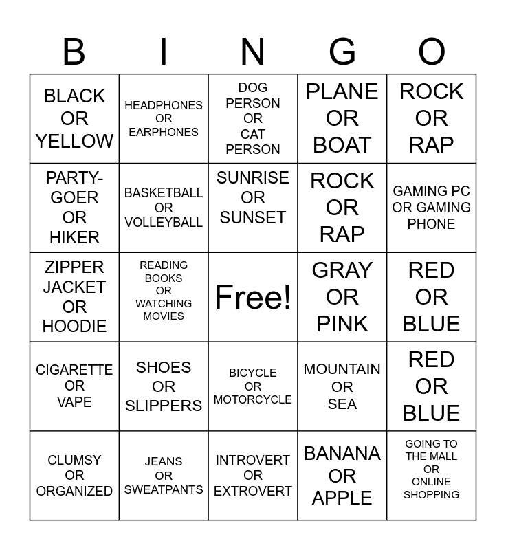 This bingo card has a free space and 28 words: RED OR BLUE, MOUNTAIN OR SEA, ROCK OR RAP, BANANA OR APPLE, PARTY-GOER OR HIKER, DOG PERSON OR CAT PERSON, HEADPHONES OR EARPHONES, CIGARETTE OR VAPE, GRAY OR PINK, CLUMSY OR ORGANIZED, ZIPPER JACKET OR HOODIE, PLANE OR BOAT, JEANS OR SWEATPANTS, INTROVERT OR EXTROVERT, GAMING PC OR GAMING PHONE, KIND OR GOOD-LOOKING, SHOES OR SLIPPERS, BASKETBALL OR VOLLEYBALL, SUNRISE OR SUNSET, BICYCLE OR MOTORCYCLE, BLACK OR YELLOW, PORK OR BEEF, GOING TO THE MALL OR ONLINE SHOPPING, READING BOOKS OR WATCHING MOVIES, RED OR BLUE, MOUNTAIN OR SEA, ROCK OR RAP and BANANA OR APPLE.