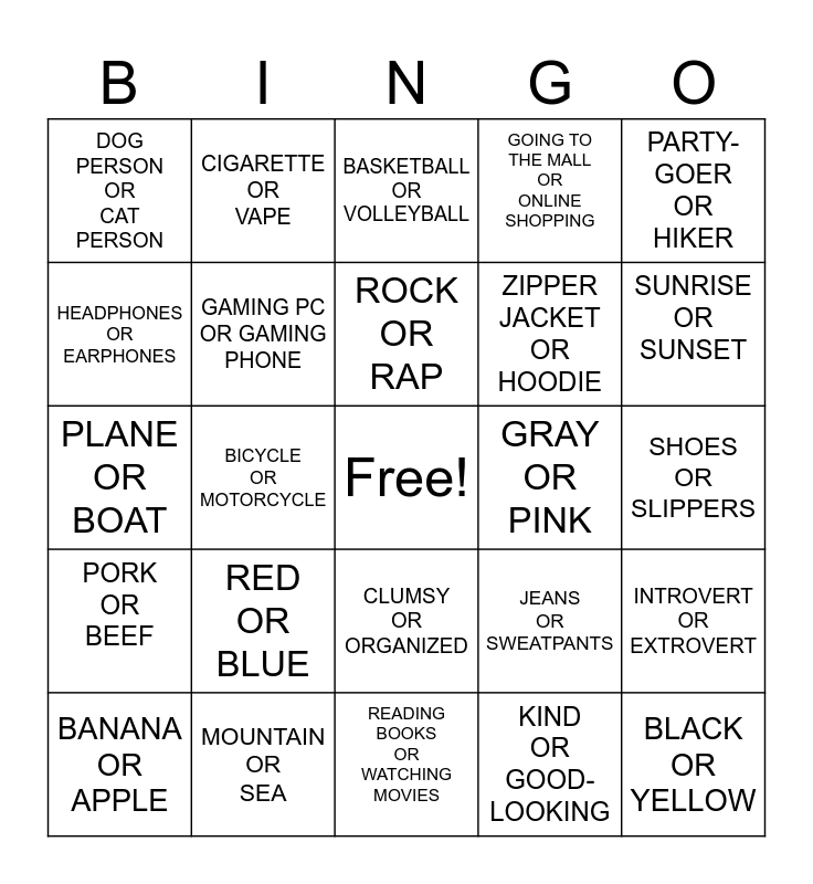 This bingo card has a free space and 24 words: RED OR BLUE, MOUNTAIN OR SEA, ROCK OR RAP, BANANA OR APPLE, PARTY-GOER OR HIKER, DOG PERSON OR CAT PERSON, HEADPHONES OR EARPHONES, CIGARETTE OR VAPE, GRAY OR PINK, CLUMSY OR ORGANIZED, ZIPPER JACKET OR HOODIE, PLANE OR BOAT, JEANS OR SWEATPANTS, INTROVERT OR EXTROVERT, GAMING PC OR GAMING PHONE, KIND OR GOOD-LOOKING, SHOES OR SLIPPERS, BASKETBALL OR VOLLEYBALL, SUNRISE OR SUNSET, BICYCLE OR MOTORCYCLE, BLACK OR YELLOW, PORK OR BEEF, GOING TO THE MALL OR ONLINE SHOPPING and READING BOOKS OR WATCHING MOVIES.