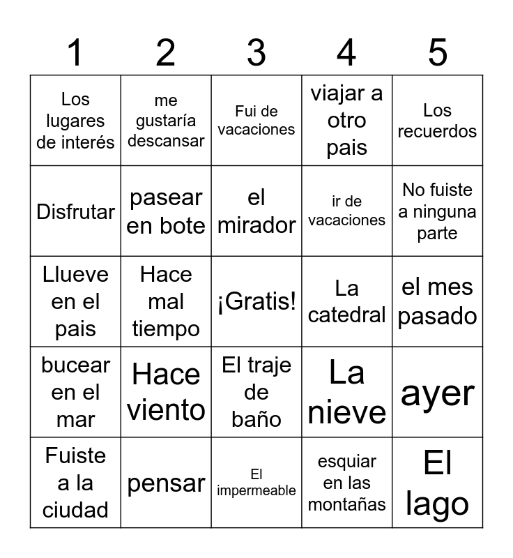 This bingo card has a free space and 58 words: las maletas, pensar, salir de la catedral, bucear en el mar, esquiar en las montañas, llevar, pasear en bote, sacar fotos, ir de vacaciones, Visitar el museo, viajar a otro pais, regresar de las ruinas, Tomar el sol en la playa, Subir la pirámide, Explorar la selva tropical, Los lugares de interés, El lago, Los recuerdos, Las cataratas, el mirador, La catedral, Fui de vacaciones, Fuiste a la ciudad, ayer, la semana pasada, el mes pasado, el año pasado, No fui a ninguna parte, No fuiste a ninguna parte, Para bucear, ¿Qué tiempo hace?, Hace calor, está cálido, Hace frío, está fresco, Hace buen tiempo, Hace sol, Hace mal tiempo, Llueve en el pais, Nieva, Hace viento, La lluvia, La nieve, La bufanda, Los guantes, Las botas, Los anteojos de sol, El traje de baño, El impermeable, El paraguas, ¡Vaya!, ¡Menos mal!, la cámara, el pasaporte, me gustaría descansar, el bronceador, Disfrutar and emocionado.