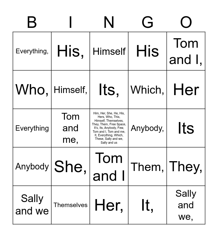 This bingo card has 52 words: Free!, Him, Her, She, He, His, Hers, Who, This, Himself, Themselves, They, Them, Free Space, It’s, Its, Anybody, Few, Tom and I, Tom and me, It, Everything, Which, These, Sally and we, Sally and us, Him,, Her,, She,, He,, His,, Hers,, Who,, This,, Himself,, Themselves,, They,, Them,, Free Space,, It’s,, Its,, Anybody,, Few,, Tom and I,, Tom and me,, It,, Everything,, Which,, These,, Sally and we,, Sally and us, Him, Her, She, He, His, Hers, Who, This, Himself, Themselves, They, Them, Free Space, It’s, Its, Anybody, Few, Tom and I, Tom and me, It, Everything, Which, These, Sally and we and Sally and us.