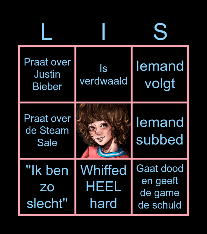 This bingo card has a free space and 16 words: ''hallo??!!'', Bot bericht in chat, Iemand volgt, Praat over Justin Bieber, ''Beagletje'', Is verdwaald, Control woord grap, Ben is de enige chatter voor 30 min, Gaat dood en geeft de game de schuld, Iemand subbed, ''Ik snap het niet'', Praat over de Steam Sale, Iemand gift een sub, Whiffed HEEL hard, ''Ik ben zo slecht'' and ''Ik ben zo goed''.