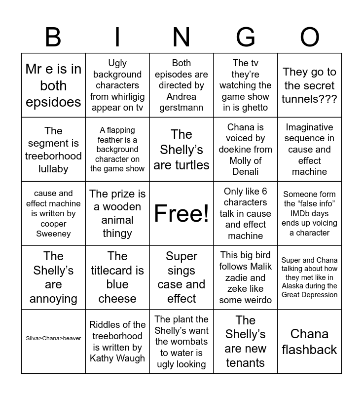 This bingo card has a free space and 24 words: The titlecard is blue cheese, Riddles of the treeborhood is written by Kathy Waugh, The Shelly’s are turtles, Silva>Chana>beaver, They go to the secret tunnels???, Mr e is in both epsidoes, The segment is treeborhood lullaby, Ugly background characters from whirligig appear on tv, Only like 6 characters talk in cause and effect machine, Super sings case and effect, Chana is voiced by doekine from Molly of Denali, cause and effect machine is written by cooper Sweeney, This big bird follows Malik zadie and zeke like some weirdo, Super and Chana talking about how they met like in Alaska during the Great Depression, A flapping feather is a background character on the game show, The Shelly’s are new tenants, Someone form the “false info” IMDb days ends up voicing a character, Both episodes are directed by Andrea gerstmann, Imaginative sequence in cause and effect machine, The prize is a wooden animal thingy, Chana flashback, The Shelly’s are annoying, The tv they’re watching the game show in is ghetto and The plant the Shelly’s want the wombats to water is ugly looking.
