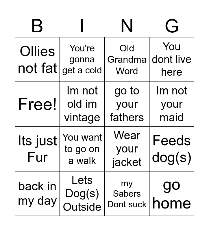 This bingo card has 16 words: Lets Dog(s) Outside, Feeds dog(s), Old Grandma Word, Ollies not fat, Its just Fur, You're gonna get a cold, Wear your jacket, my Sabers Dont suck, Free!, Im not old im vintage, back in my day, You dont live here, You want to go on a walk, Im not your maid, go to your fathers and go home.