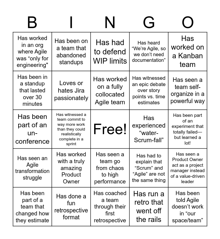 This bingo card has a free space and 34 words: Has worked on a team with no dedicated Scrum Master, Has run a retro that went off the rails, Has participated in a Lean Coffee session, Has had a stakeholder demand a deadline without context, Has seen an Agile transformation struggle, Loves or hates Jira passionately, Has worked on a Kanban team, Has been part of a team that changed how they estimate, Has been on a team that abandoned standups, Has taught someone about Agile, Has worked on a fully collocated Agile team, Has had to defend WIP limits, Has tried a new Agile framework (SAFe, LeSS, etc.), Has been on a team that monitored cycle time and actively tried to decrease it, Has experienced “water-Scrum-fall”, Has seen a team self-organize in a powerful way, Has done a fun retrospective format, Has been part of an un-conference, Has worked with a truly amazing Product Owner, Has had to explain that “Scrum” and “Agile” are not the same thing, Has seen a team go from chaos to high performance, Has done mob or pair programming, Has worked in an org where Agile was “only for engineering", Has been part of an experiment that totally failed—but learned a lot!, Has coached a team through their first retrospective, Has been told Agile doesn’t work in “our space/team”, Has heard “We’re Agile, so we don’t need documentation”, Has argued about what Definition of Ready or Done should include, Has witnessed an epic debate over story points vs. time estimates, Has been in a standup that lasted over 30 minutes, Has seen a team struggle with too many priorities at once, Has witnessed a team commit to way more work than they could realistically complete in a sprint, Has seen a Product Owner act as a project manager instead of a value-driven leader and Has worked with a team that only did Agile ceremonies but didn’t embrace Agile values.
