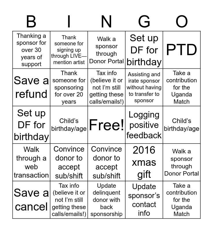 This bingo card has a free space and 49 words: Take a contribution for CGN, Take a contribution for the Uganda Match, Save a cancel, Update delinquent donor with back sponsorship, Convince donor to accept sub/shift, Walk through a web transaction, Thank someone for signing up through LIVE—mention artist, Enroll in AGP, Save a refund, Thank someone for sponsoring for over 10 years, Thank someone for sponsoring for over 20 years, Set up DF for birthday, Walk a sponsor through Donor Portal, 2016 xmas gift, Gift Catalog inquiry, Child’s address, Tax info (believe it or not I’m still getting these calls/emails!), Logging positive feedback, New cc, PTD, Child’s birthday/age, Update sponsor’s contact info, Thanking a sponsor for over 30 years of support, Assisting and irate sponsor without having to transfer to sponsor, Take a contribution for CGN, Take a contribution for the Uganda Match, Save a cancel, Update delinquent donor with back sponsorship, Convince donor to accept sub/shift, Walk through a web transaction, Thank someone for signing up through LIVE—mention artist, Enroll in AGP, Save a refund, Thank someone for sponsoring for over 10 years, Tax info (believe it or not I’m still getting these calls/emails!), Logging positive feedback, New cc, PTD, Child’s birthday/age, Update sponsor’s contact info, Thanking a sponsor for over 30 years of support, Assisting and irate sponsor without having to transfer to sponsor, Update contact info, Thank someone for sponsoring for over 20 years, Set up DF for birthday, Walk a sponsor through Donor Portal, 2016 xmas gift, Gift Catalog inquiry and Child’s address.