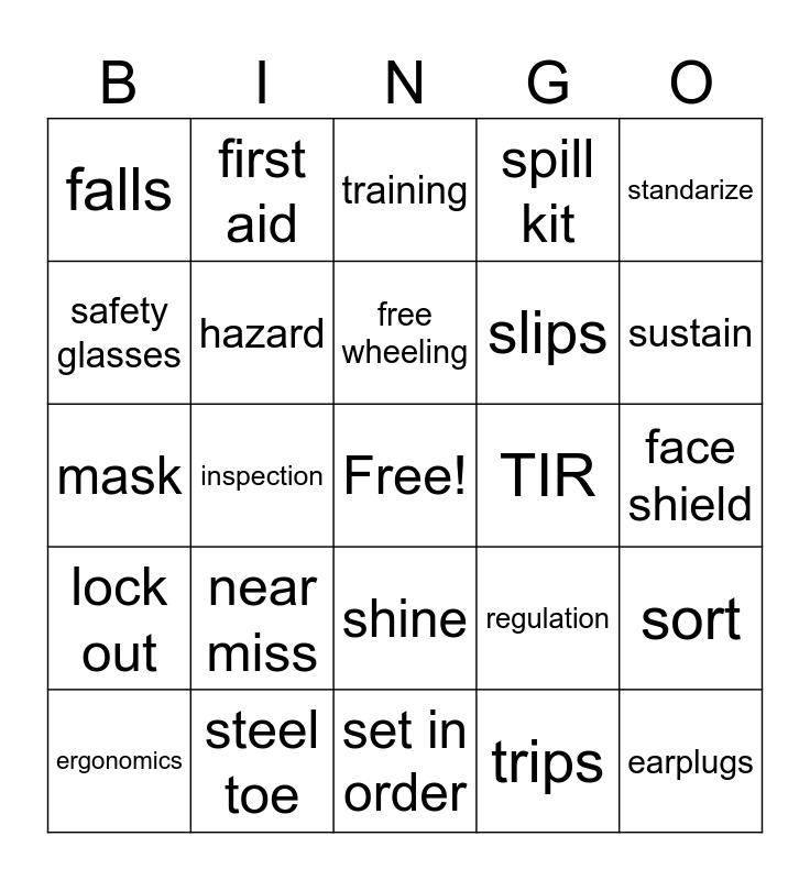 This bingo card has a free space and 24 words: near miss, steel toe, free wheeling, ergonomics, standarize, falls, safety glasses, first aid, TIR, shine, slips, mask, regulation, sort, hazard, trips, face shield, training, sustain, inspection, earplugs, lock out, spill kit and set in order.