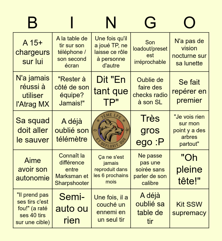 This bingo card has a free space and 24 words: "Il prend pas ses tirs c'est fou!" (a raté ses 40 tirs sur une cible), Connaît la différence entre Marksman et Sharpshooter, Dit "En tant que TP", A déjà oublié sa table de tir, N'a pas de vision nocturne sur sa lunette, A 15+ chargeurs sur lui, A la table de tir sur son téléphone / son second écran, Une fois qu'il a joué TP, ne laisse ce rôle à personne d'autre, Très gros ego :P, "Je vois rien sur mon point y a des arbres partout", Sa squad doit aller le sauver, "Rester à côté de son équipe? Jamais!", Ne passe pas une soirée sans parler de son calibre, "Oh pleine tête!", N'a jamais réussi à utiliser l'Atrag MX, Semi-auto ou rien, Une fois, il a couché un ennemi en un seul tir, Son loadout/preset est irréprochable, Se fait repérer en premier, Aime avoir son autonomie, A déjà oublié son télémètre, Ça ne s'est jamais reproduit dans les 6 prochains mois, Oublie de faire des checks radio à son SL and Kit SSW supremacy.