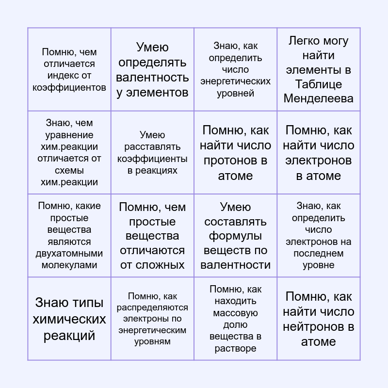 This bingo card has 16 words: Помню, как распределяются электроны по энергетическим уровням, Знаю, как определить число электронов на последнем уровне, Знаю, как определить число энергетических уровней, Помню, чем отличается индекс от коэффициентов, Помню, какие простые вещества являются двухатомными молекулами, Умею определять валентность у элементов, Умею составлять формулы веществ по валентности, Помню, как находить массовую долю вещества в растворе, Знаю, чем уравнение хим.реакции отличается от схемы хим.реакции, Умею расставлять коэффициенты в реакциях, Знаю типы химических реакций, Легко могу найти элементы в Таблице Менделеева, Помню, чем простые вещества отличаются от сложных, Помню, как найти число электронов в атоме, Помню, как найти число протонов в атоме and Помню, как найти число нейтронов в атоме.
