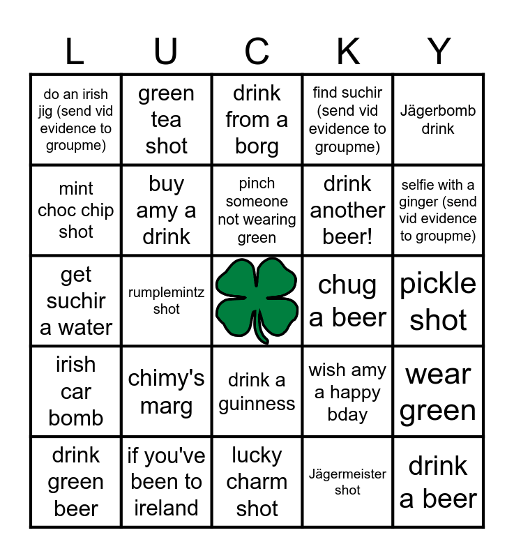 This bingo card has a free space and 24 words: chimy's marg, if you've been to ireland, pinch someone not wearing green, drink green beer, Jägerbomb drink, do an irish jig (send vid evidence to groupme), mint choc chip shot, green tea shot, chug a beer, drink a guinness, drink another beer!, get suchir a water, wish amy a happy bday, wear green, buy amy a drink, Jägermeister shot, pickle shot, drink from a borg, selfie with a ginger (send vid evidence to groupme), rumplemintz shot, drink a beer, irish car bomb, find suchir (send vid evidence to groupme) and lucky charm shot.