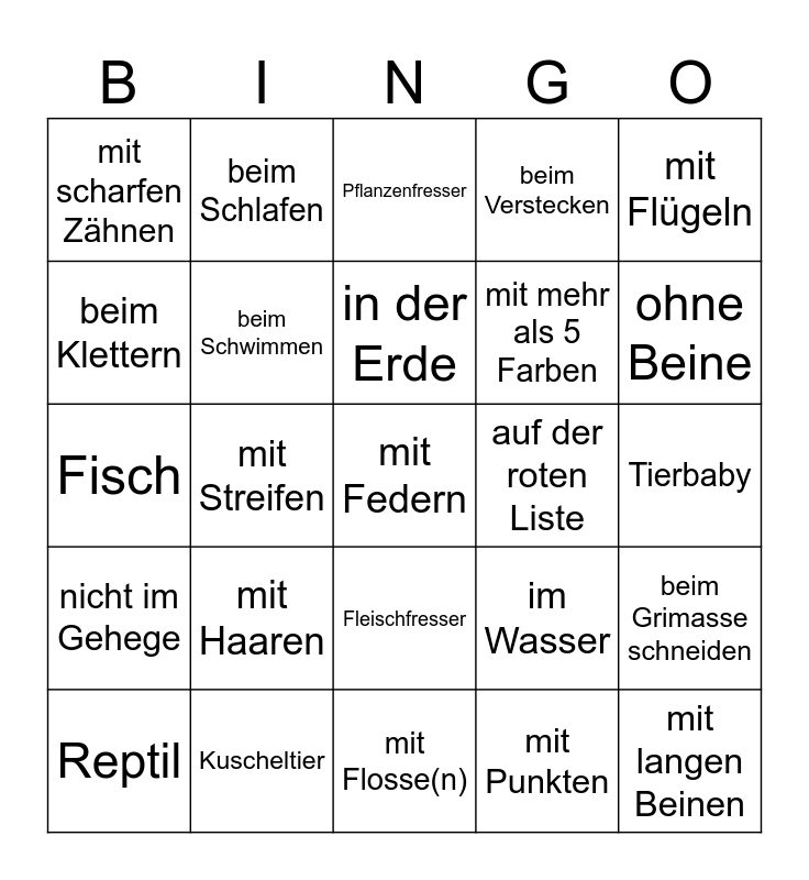 This bingo card has 50 words: Free!, mit Federn, mit Schnabel, mit Flosse(n), mit Haaren, mit Schuppen, beim Schlafen, beim Essen, beim Klettern, beim Fliegen, beim Schwimmen, beim Verstecken, beim Grimasse schneiden, im Wasser, auf einem Baum, in der Luft, in der Erde, auf der roten Liste, mit Schwanz, mit Flügeln, mit Streifen, mit Punkten, mit scharfen Zähnen, mit mehr als 5 Farben, in einer Farbe, mit langen Beinen, ohne Beine, das Eier legt, Pflanzenfresser, Fleischfresser, kleiner als 10 cm, größer als 2 Meter, schwerer als 1 Tonne, leichter als 1 kg, Kuscheltier, -art aus Asien, -art aus Afrika, -art aus Amerika, -art aus Australien, Tierbaby, mit Hufen, mit Krallen, wirbelloses Tier, Säugetier, Reptil, Fisch, Vogel, Affenart, nicht im Gehege and mit Bart.