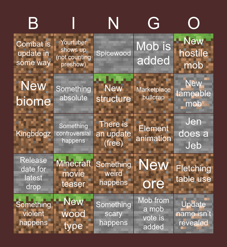 This bingo card has 24 images, a free space and 24 words: Minecraft movie teaser, New wood type, New structure, Something violent happens, New hostile mob, Combat is update in some way, New biome, Yourtuber shows up (not counting preshow), Element animation, Something weird happens, Marketplace bullcrap, Kingbdogz, New ore, Fletching table use, Something absolute, Mob from a mob vote is added, Jen does a Jeb, Spicewood, New tameable mob, Something controversial happens, Update name isn’t revealed, Release date for latest drop, Mob is added and Something scary happens.