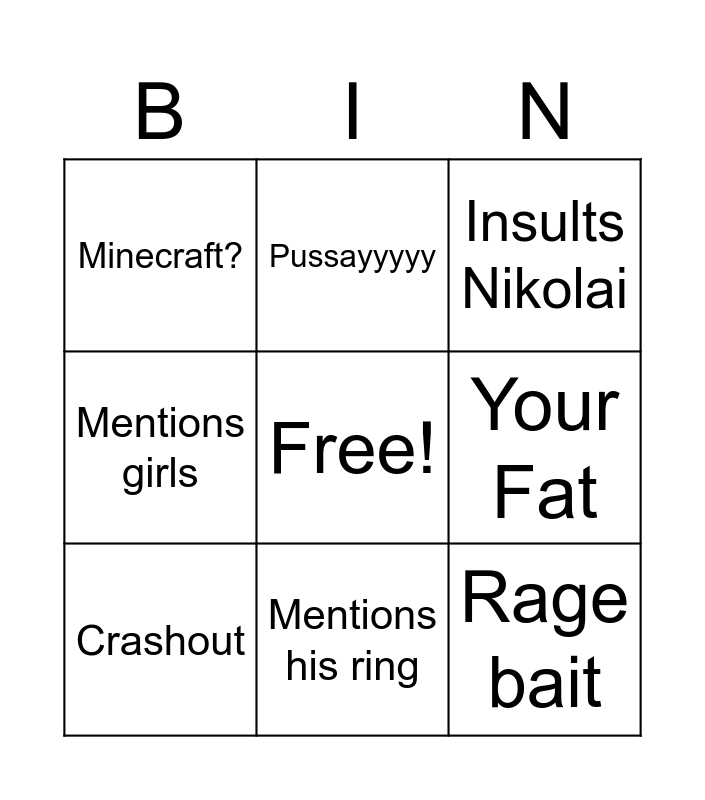 This bingo card has a free space and 9 words: Crashout, Mentions his ring, Insults Nikolai, Minecraft?, Pussayyyyy, Your Fat, Mentions girls, What do you do with your life? and Rage bait.