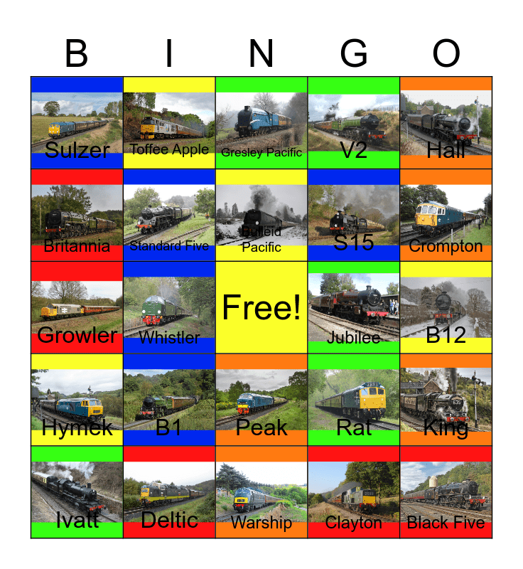 This bingo card has 24 images, a free space and 24 words: B1, Deltic, Bulleid Pacific, Ivatt, Hall, Sulzer, Britannia, Toffee Apple, Jubilee, Peak, S15, Growler, Rat, King, Standard Five, Clayton, B12, Gresley Pacific, Crompton, Whistler, Black Five, Hymek, V2 and Warship.