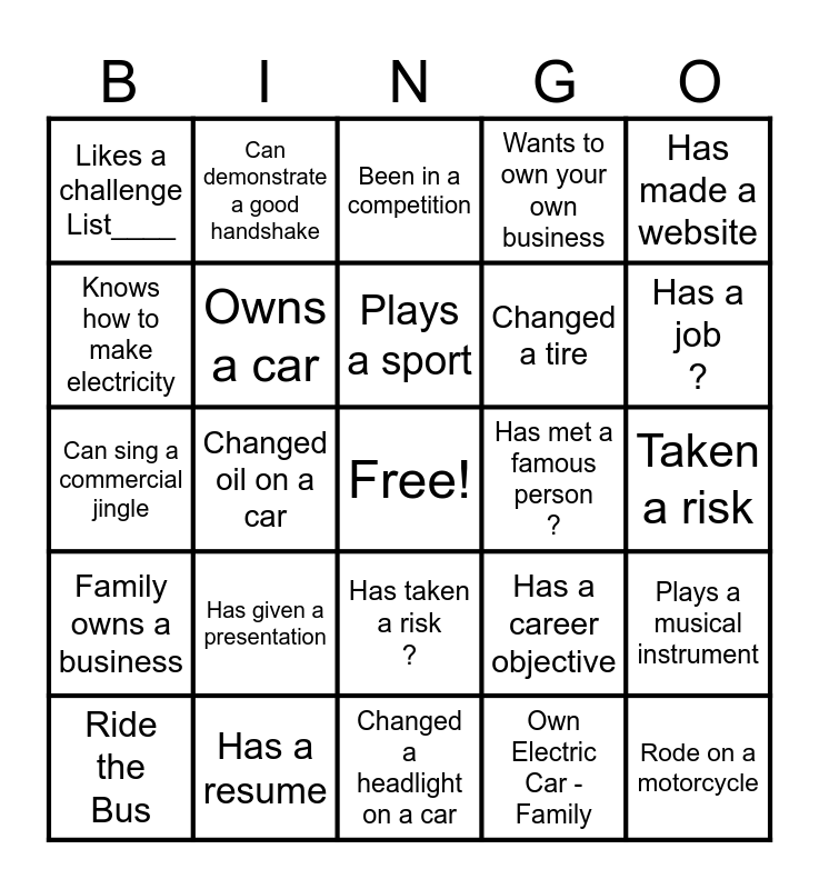 This bingo card has a free space and 29 words: Ride the Bus, Has an invention idea What____?, Changed oil on a car, Has led a group, Likes a challenge List____, Been in a competition, Owns a car, Has given a presentation, Has met a famous person ?, Has a resume, Taken a risk, Rode on a motorcycle, Changed a headlight on a car, Own Electric Car - Family, Has a job ?, Ride a Bike, Has taken a risk ?, Family owns a business, Has made a website, Can sing a commercial jingle, Has a career objective, Sold something you made ?, Changed a tire, Knows how to make electricity, Wants to own your own business, Can demonstrate a good handshake, Plays a musical instrument, Plays a sport and Has been in a parade.