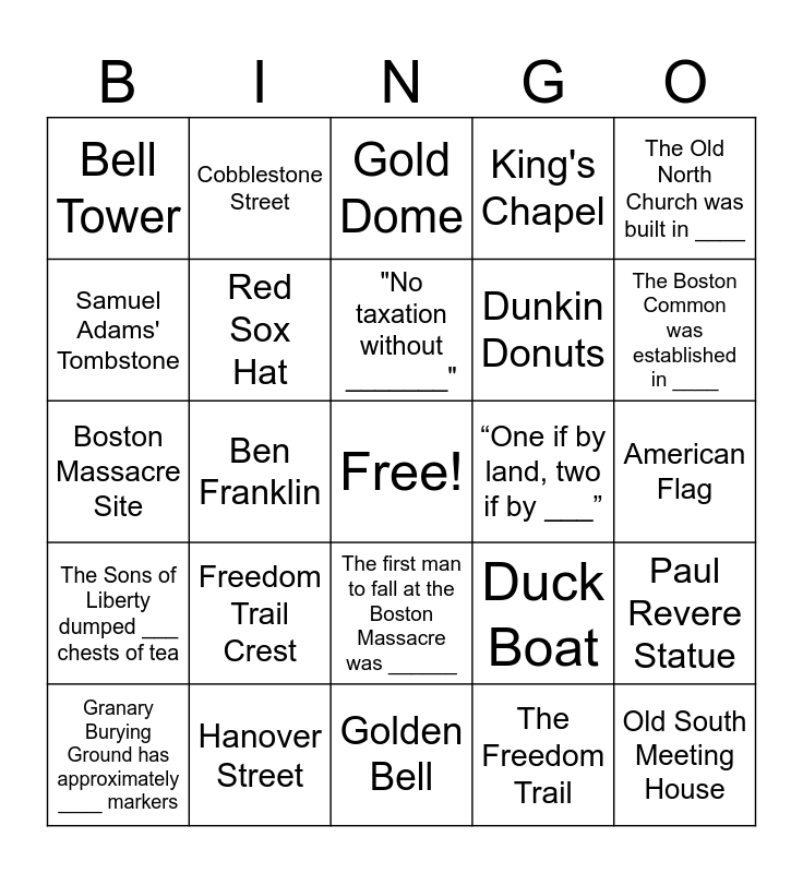 This bingo card has a free space and 24 words: Freedom Trail Crest, Hanover Street, "No taxation without _______", Granary Burying Ground has approximately ____ markers, The Old North Church was built in ____, Bell Tower, Samuel Adams' Tombstone, Cobblestone Street, “One if by land, two if by ___”, The first man to fall at the Boston Massacre was ______, Dunkin Donuts, Boston Massacre Site, Duck Boat, Paul Revere Statue, Red Sox Hat, The Freedom Trail, American Flag, Gold Dome, The Boston Common was established in ____, Ben Franklin, Old South Meeting House, The Sons of Liberty dumped ___ chests of tea, King's Chapel and Golden Bell.