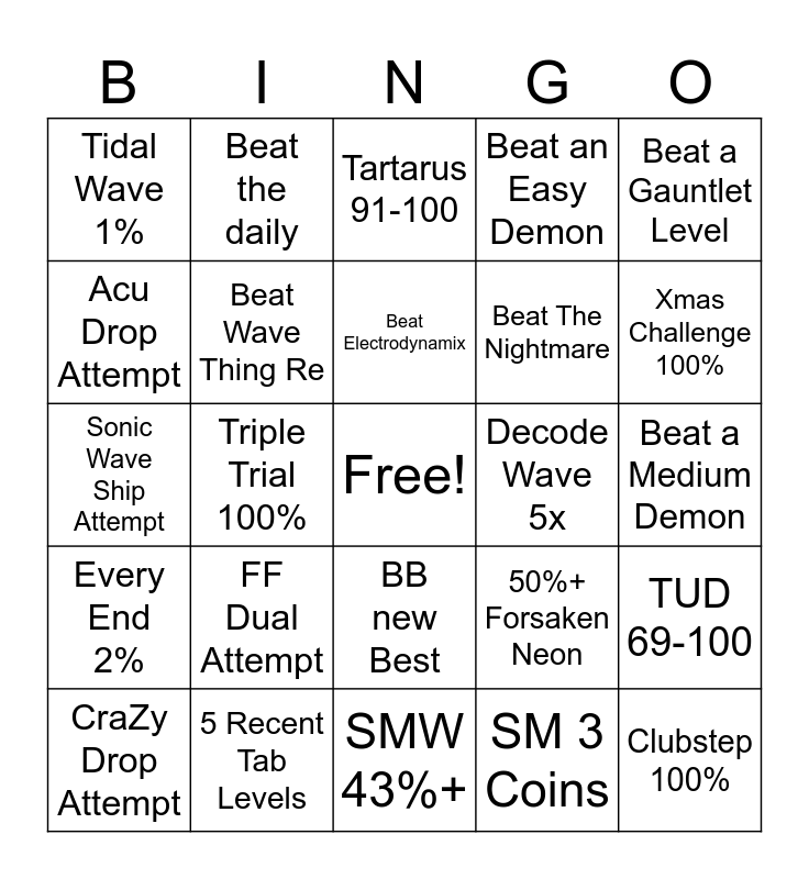 This bingo card has a free space and 24 words: FF Dual Attempt, 5 Recent Tab Levels, Beat Electrodynamix, CraZy Drop Attempt, Beat a Gauntlet Level, Tidal Wave 1%, Acu Drop Attempt, Beat the daily, Decode Wave 5x, BB new Best, Beat The Nightmare, Sonic Wave Ship Attempt, 50%+ Forsaken Neon, TUD 69-100, Beat Wave Thing Re, SM 3 Coins, Beat a Medium Demon, Tartarus 91-100, Xmas Challenge 100%, Triple Trial 100%, Clubstep 100%, Every End 2%, Beat an Easy Demon and SMW 43%+.