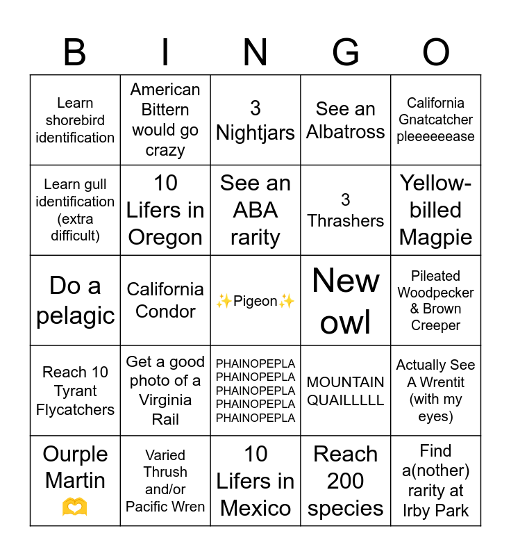 This bingo card has a free space and 24 words: Get a good photo of a Virginia Rail, Varied Thrush and/or Pacific Wren, See an ABA rarity, Ourple Martin 🫶, California Gnatcatcher pleeeeeease, Learn shorebird identification, Learn gull identification (extra difficult), American Bittern would go crazy, New owl, PHAINOPEPLA PHAINOPEPLA PHAINOPEPLA PHAINOPEPLA PHAINOPEPLA, 3 Thrashers, Do a pelagic, MOUNTAIN QUAILLLLL, Actually See A Wrentit (with my eyes), 10 Lifers in Oregon, Reach 200 species, Pileated Woodpecker & Brown Creeper, 3 Nightjars, Yellow-billed Magpie, California Condor, Find a(nother) rarity at Irby Park, Reach 10 Tyrant Flycatchers, See an Albatross and 10 Lifers in Mexico.