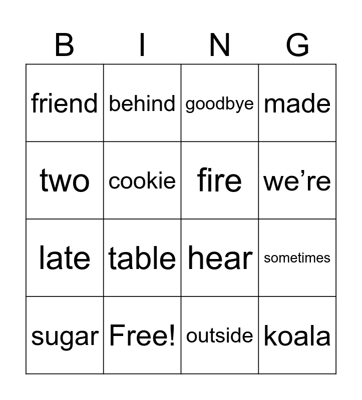 This bingo card has 22 words: Free!, apron, behind, colour, cookie, fire, friend, goodbye, hear, koala, late, made, nothing, once, outside, shape, sometimes, sugar, table, two, we’re and who.