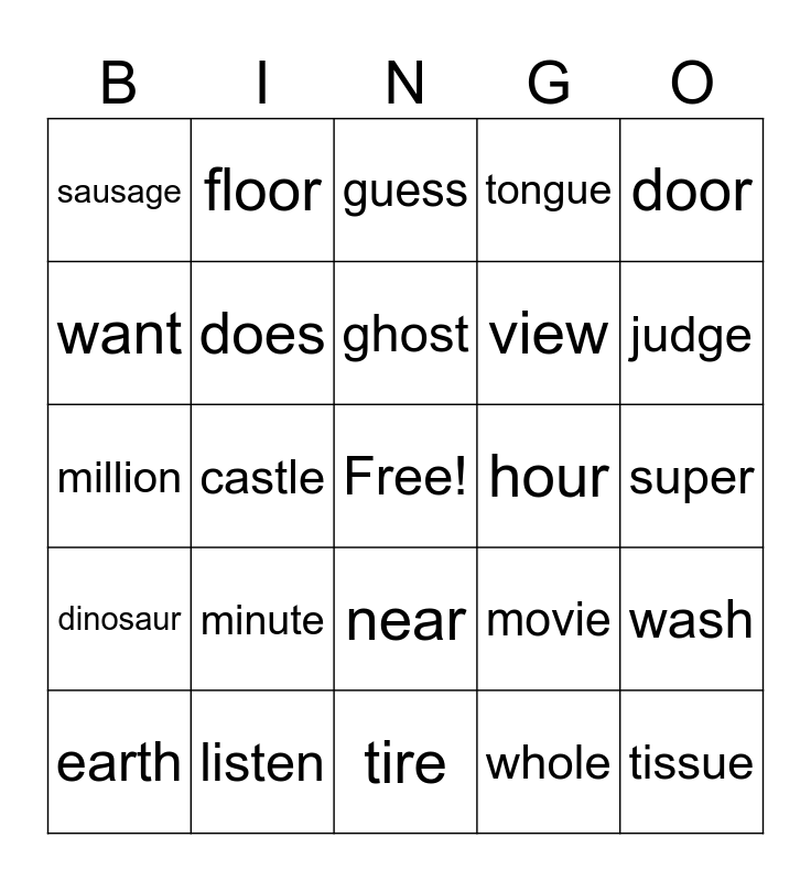 This bingo card has a free space and 33 words: any, bridges, castle, comfy, dinosaur, does, door, earth, floor, furniture, ghost, guess, guest, Guy, hour, judge, listen, million, minute, movie, near, queue, sausage, super, tire, tissue, tongue, view, want, wash, Wednesday, whole and won.