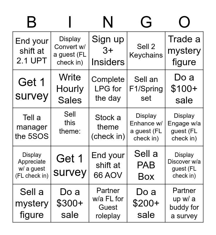 This bingo card has a free space and 24 words: Get 1 survey, Do a $300+ sale, Complete LPG for the day, Sell a mystery figure, Trade a mystery figure, End your shift at 2.1 UPT, Get 1 survey, Display Convert w/ a guest (FL check in), Display Enhance w/ a guest (FL check in), End your shift at 66 AOV, Sell an F1/Spring set, Tell a manager the 5SOS, Sell a PAB Box, Display Discover w/a guest (FL check in), Write Hourly Sales, Do a $200+ sale, Display Engage w/a guest (FL check in), Sign up 3+ Insiders, Do a $100+ sale, Sell this theme:, Partner up w/ a buddy for a survey, Display Appreciate w/ a guest (FL check in), Sell 2 Keychains and Partner w/a FL for Guest roleplay.