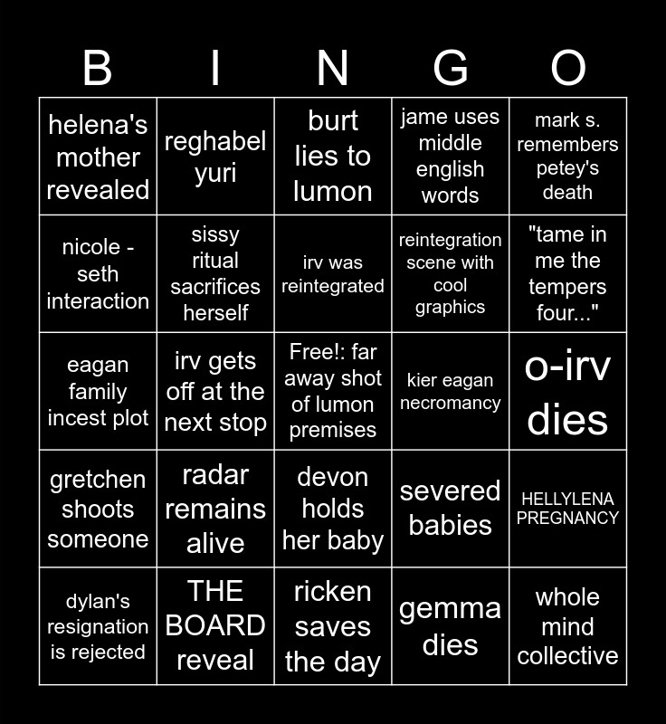 This bingo card has a free space and 24 words: radar remains alive, THE BOARD reveal, irv was reintegrated, dylan's resignation is rejected, mark s. remembers petey's death, helena's mother revealed, nicole - seth interaction, reghabel yuri, kier eagan necromancy, devon holds her baby, reintegration scene with cool graphics, eagan family incest plot, severed babies, HELLYLENA PREGNANCY, sissy ritual sacrifices herself, gemma dies, o-irv dies, burt lies to lumon, "tame in me the tempers four...", irv gets off at the next stop, whole mind collective, gretchen shoots someone, jame uses middle english words and ricken saves the day.