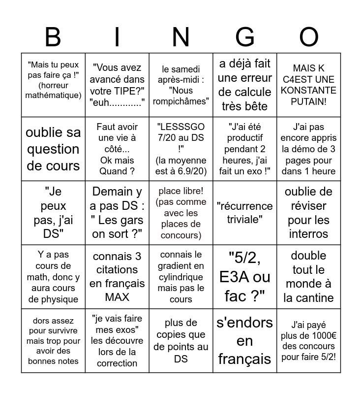 This bingo card has a free space and 24 words: connais 3 citations en français MAX, "je vais faire mes exos" les découvre lors de la correction, "LESSSGO 7/20 au DS !" (la moyenne est à 6.9/20), dors assez pour survivre mais trop pour avoir des bonnes notes, MAIS K C4EST UNE KONSTANTE PUTAIN!, "Mais tu peux pas faire ça !" (horreur mathématique), oublie sa question de cours, "Vous avez avancé dans votre TIPE?" "euh............", "récurrence triviale", connais le gradient en cylindrique mais pas le cours, "J'ai été productif pendant 2 heures, j'ai fait un exo !", "Je peux pas, j'ai DS", "5/2, E3A ou fac ?", double tout le monde à la cantine, Faut avoir une vie à côté... Ok mais Quand ?, s'endors en français, oublie de réviser pour les interros, le samedi après-midi : "Nous rompichâmes", J'ai pas encore appris la démo de 3 pages pour dans 1 heure, Demain y a pas DS : " Les gars on sort ?", J'ai payé plus de 1000€ des concours pour faire 5/2!, Y a pas cours de math, donc y aura cours de physique, a déjà fait une erreur de calcule très bête and plus de copies que de points au DS.
