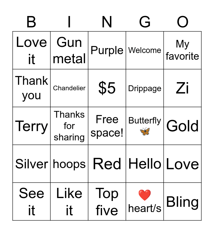 This bingo card has a free space and 24 words: hoops, Like it, $5, See it, My favorite, Love it, Thank you, Gun metal, Butterfly 🦋, Red, Drippage, Terry, Hello, Love, Chandelier, ❤️ heart/s, Gold, Purple, Zi, Thanks for sharing, Bling, Silver, Welcome and Top five.