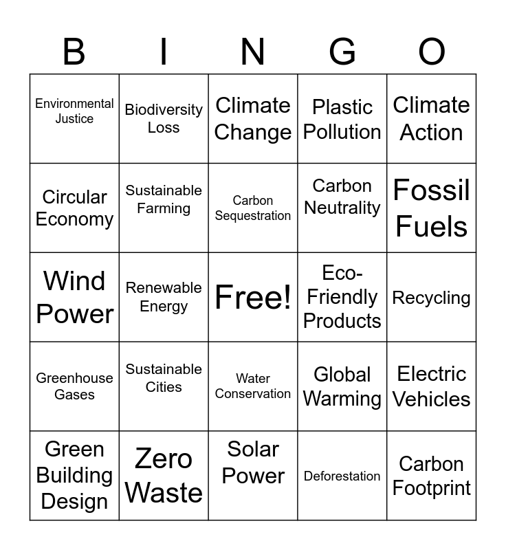 This bingo card has a free space and 24 words: Sustainable Cities, Zero Waste, Carbon Sequestration, Green Building Design, Climate Action, Environmental Justice, Circular Economy, Biodiversity Loss, Eco-Friendly Products, Water Conservation, Carbon Neutrality, Wind Power, Global Warming, Electric Vehicles, Sustainable Farming, Deforestation, Recycling, Climate Change, Fossil Fuels, Renewable Energy, Carbon Footprint, Greenhouse Gases, Plastic Pollution and Solar Power.