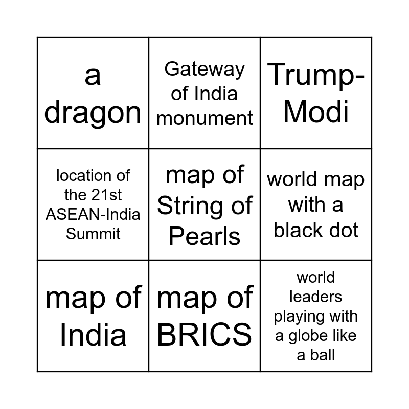This bingo card has 9 words: map of India, Trump-Modi, Gateway of India monument, location of the 21st ASEAN-India Summit, a dragon, world map with a black dot, map of String of Pearls, world leaders playing with a globe like a ball and map of BRICS.