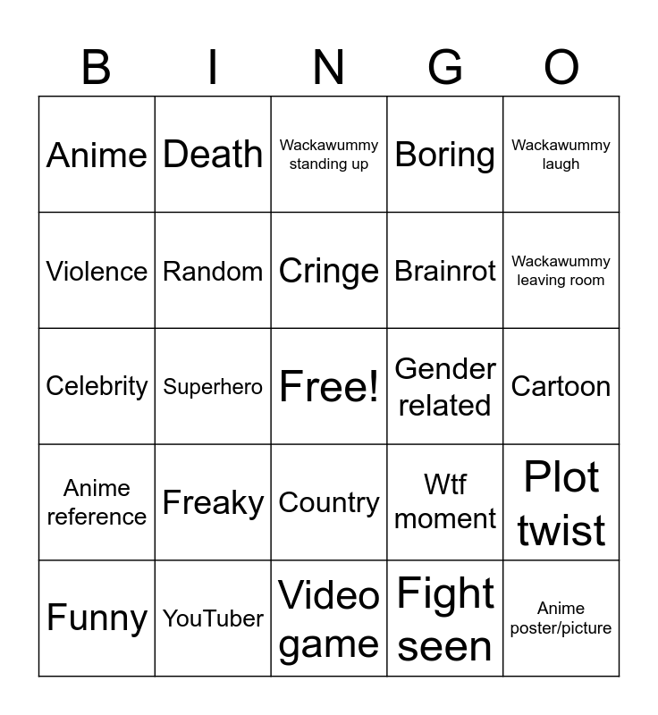 This bingo card has a free space and 24 words: Freaky, YouTuber, Cringe, Funny, Wackawummy laugh, Anime, Violence, Death, Gender related, Country, Brainrot, Celebrity, Wtf moment, Plot twist, Random, Fight seen, Cartoon, Wackawummy standing up, Wackawummy leaving room, Superhero, Anime poster/picture, Anime reference, Boring and Video game.