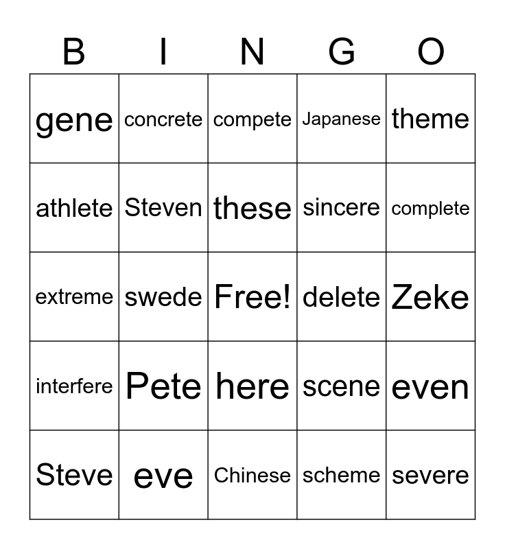 This bingo card has a free space and 24 words: Pete, eve, these, Steve, theme, gene, athlete, concrete, delete, here, sincere, extreme, scene, even, Steven, scheme, Zeke, compete, complete, swede, severe, interfere, Japanese and Chinese.