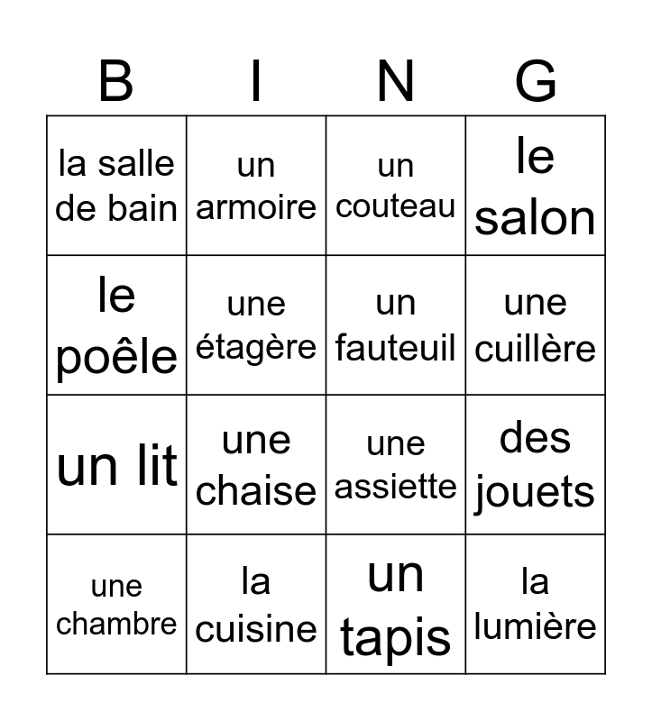 This bingo card has 16 words: la cuisine, des jouets, un couteau, la salle de bain, un lit, un armoire, une assiette, un tapis, le poêle, une étagère, une chambre, le salon, une chaise, une cuillère, un fauteuil and la lumière.