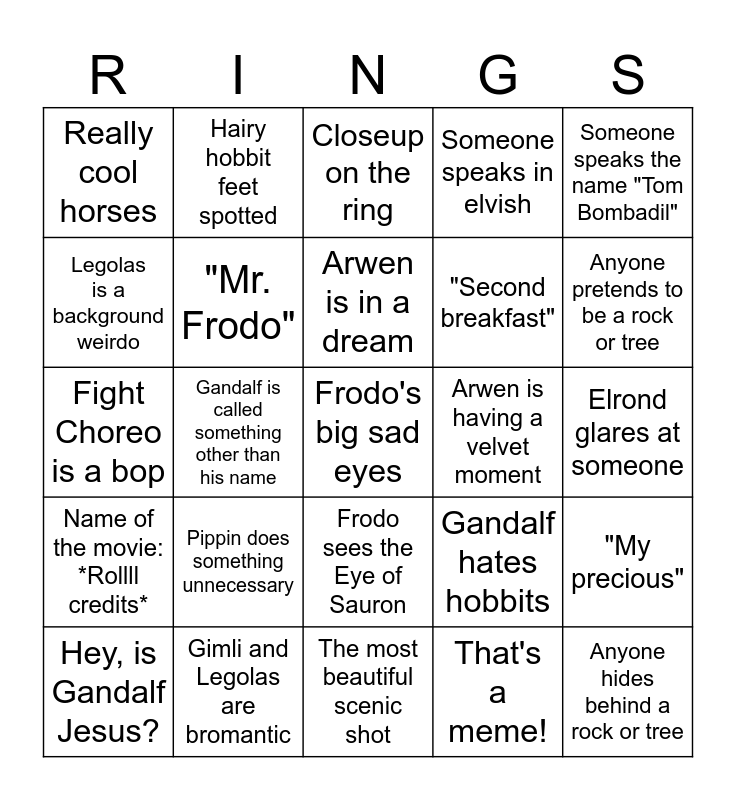 This bingo card has 30 words: Gimli and Legolas are bromantic, Legolas talks, Gandalf is called something other than his name, Drinking looks pretty neat, actually, Really cool horses, Closeup on the ring, "Mr. Frodo", Frodo sees the Eye of Sauron, Arwen is having a velvet moment, The most beautiful scenic shot, Elrond glares at someone, Frodo's big sad eyes, That's a meme!, Anyone hides behind a rock or tree, Anyone pretends to be a rock or tree, Gandalf loves hobbits, Gandalf hates hobbits, Name of the movie: *Rollll credits*, Pippin does something unnecessary, Someone speaks the name "Tom Bombadil", Fight Choreo is a bop, Boromir looks like a bad guy, Hairy hobbit feet spotted, "Second breakfast", Legolas is a background weirdo, Someone speaks in elvish, "My precious", Hey, is Gandalf Jesus?, Arwen is in a dream and A Galadriel gift saves the day.