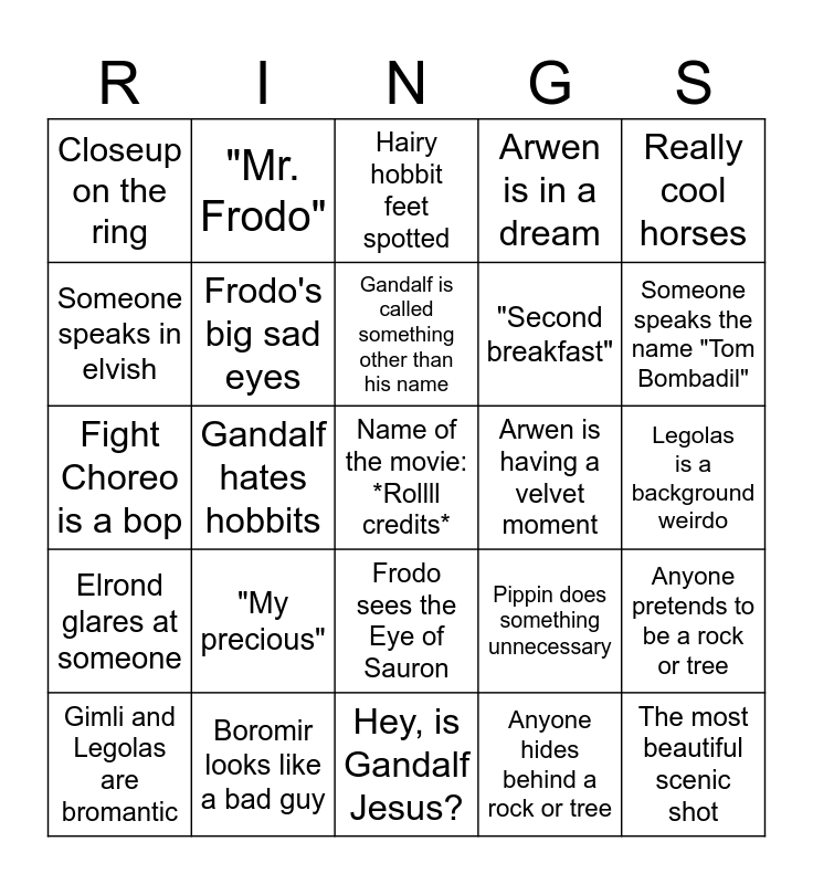 This bingo card has 30 words: Gimli and Legolas are bromantic, Legolas talks, Gandalf is called something other than his name, Drinking looks pretty neat, actually, Really cool horses, Closeup on the ring, "Mr. Frodo", Frodo sees the Eye of Sauron, Arwen is having a velvet moment, The most beautiful scenic shot, Elrond glares at someone, Frodo's big sad eyes, That's a meme!, Anyone hides behind a rock or tree, Anyone pretends to be a rock or tree, Gandalf loves hobbits, Gandalf hates hobbits, Name of the movie: *Rollll credits*, Pippin does something unnecessary, Someone speaks the name "Tom Bombadil", Fight Choreo is a bop, Boromir looks like a bad guy, Hairy hobbit feet spotted, "Second breakfast", Legolas is a background weirdo, Someone speaks in elvish, "My precious", Hey, is Gandalf Jesus?, Arwen is in a dream and A Galadriel gift saves the day.