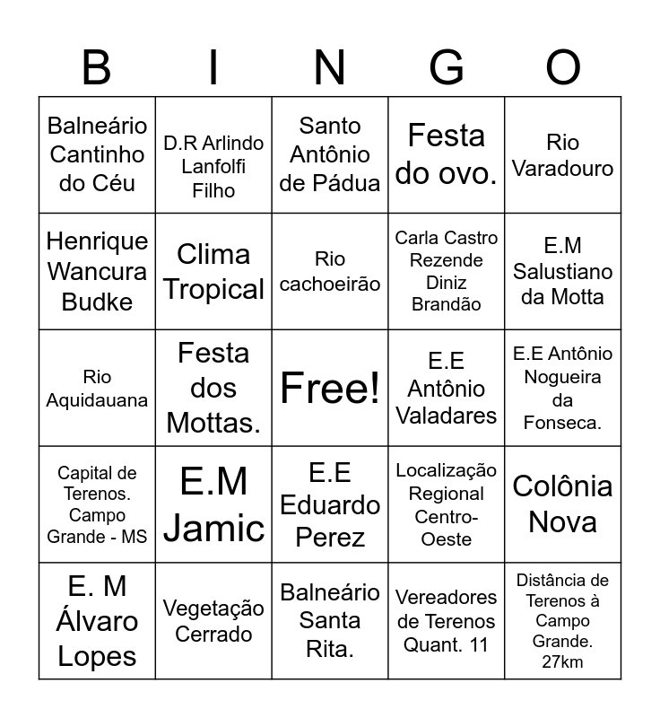 This bingo card has a free space and 24 words: E.M Jamic, Vegetação Cerrado, Rio cachoeirão, E. M Álvaro Lopes, Rio Varadouro, Balneário Cantinho do Céu, Henrique Wancura Budke, D.R Arlindo Lanfolfi Filho, E.E Antônio Valadares, E.E Eduardo Perez, Carla Castro Rezende Diniz Brandão, Rio Aquidauana, Localização Regional Centro-Oeste, Colônia Nova, Clima Tropical, Vereadores de Terenos Quant. 11, E.E Antônio Nogueira da Fonseca., Santo Antônio de Pádua, E.M Salustiano da Motta, Festa dos Mottas., Distância de Terenos à Campo Grande. 27km, Capital de Terenos. Campo Grande - MS, Festa do ovo. and Balneário Santa Rita..