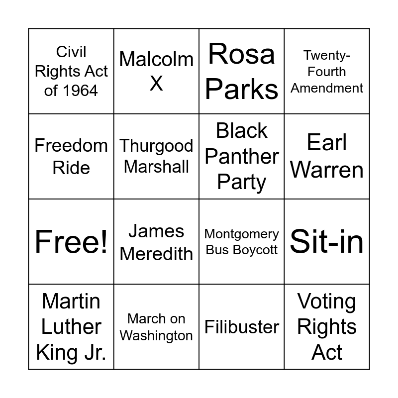 This bingo card has 20 words: Sit-in, Brown v. Board of Education, Rosa Parks, SNCC, Martin Luther King Jr., Freedom Ride, March on Washington, Civil Rights Act of 1964, Free!, Malcolm X, James Meredith, Montgomery Bus Boycott, Thurgood Marshall, Voting Rights Act, Black Panther Party, Freedom Summer, Earl Warren, Twenty-Fourth Amendment, Filibuster and Nation of Islam.