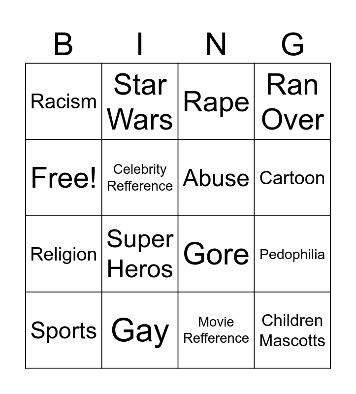 This bingo card has 16 words: Gay, Pedophilia, Rape, Racism, Religion, Star Wars, Gore, Movie Refference, Free!, Celebrity Refference, Sports, Ran Over, Super Heros, Cartoon, Abuse and Children Mascotts.