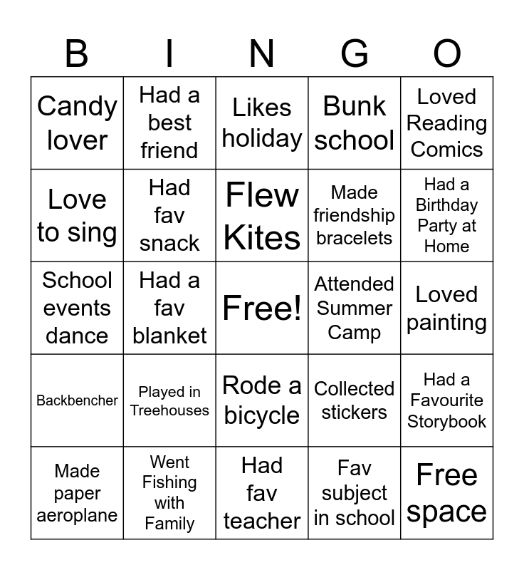 This bingo card has a free space and 24 words: Played in Treehouses, Went Fishing with Family, Flew Kites, Made paper aeroplane, Loved Reading Comics, Candy lover, Love to sing, Had a best friend, Attended Summer Camp, Rode a bicycle, Made friendship bracelets, School events dance, Collected stickers, Had a Favourite Storybook, Had fav snack, Fav subject in school, Loved painting, Likes holiday, Had a Birthday Party at Home, Had a fav blanket, Free space, Backbencher, Bunk school and Had fav teacher.