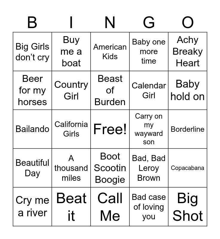 This bingo card has a free space and 104 words: ABC, Abracadabra, Achy Breaky Heart, Addicted to love, Africa, Alive, All along the watchtower, All-American GIrl, All night long, All Star, All Summer Long, All that she wants, All the small things, Alone, Always be my baby, All American girl (Petty), American Kids, American Pie, American Woman, Amie, Another Brick in the wall, Another one bites the dust, Any man of mine, Any way you want it, As good as I once was, A thousand miles, Baby hold on, Baby one more time, Back in black, Back When, Bad, Bad Leroy Brown, Bad case of loving you, Bad romance, Barbara Ann, Barracuda, Bartender, Basket Case, Be Alright, Beast of Burden, Beat it, Beautiful, Beautiful Day, Beautiful Girls, Beer for my horses, Best of you, Big Girls don’t cry, Big green tractor, Big Shot, Bills, Bills, Bills, Bitter Sweet Symphony, Black, Black Betty, Black Cat, Bad medicine, Black Hole Sun, Black Magic Woman, Black or white, Blame it on the rain, Bleeding Love, Boot Scootin Boogie, Borderline, Born in the USA, Born to be wild, Born to run, Boyfriend, Boys round here, Bust a move, Buy me a boat, Bailando, California Girls, Call Me, Call me maybe, Californication, Clocks, Cruise, Crazy in love, Crash and burn, Cry me a river, Crazy, (You drive me) Crazy, Creep, Crash into me, Country Girl, Carolina on my mind, Carry on my wayward son, Centerfold, Chain of fools, Cherry Pie, Chicken Fried, Closing Time, Cold as Ice, Come to my window, Complicated, Copacabana, Cradle of Love, Crocodile Rock, Cuts like a knife, Calendar Girl, Careless Whiper, Cupid, Crazy Town, Counting Stars, Candle in the wind and Can’t help falling in love.