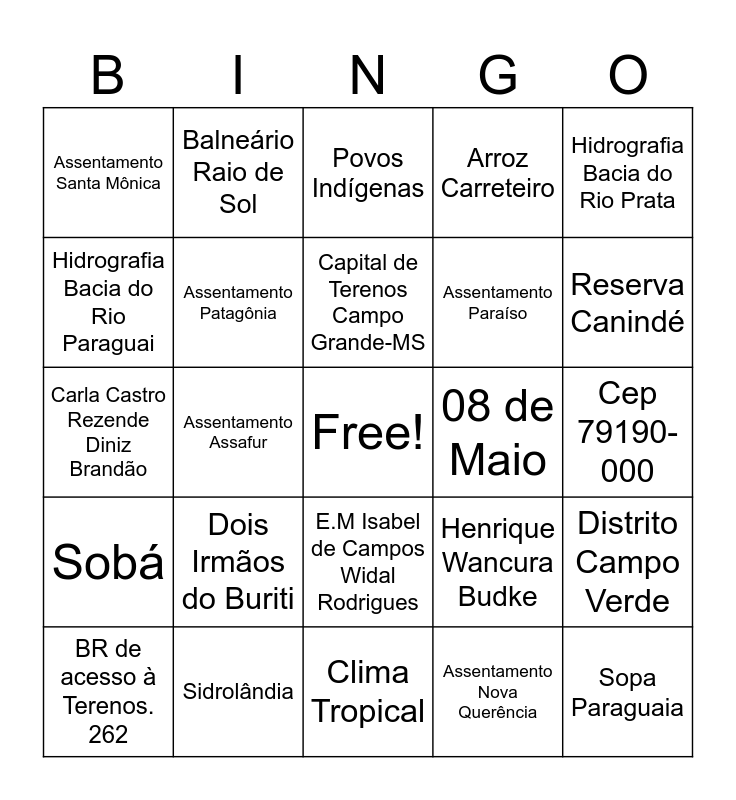 This bingo card has a free space and 24 words: Dois Irmãos do Buriti, Sidrolândia, Capital de Terenos Campo Grande-MS, BR de acesso à Terenos. 262, Hidrografia Bacia do Rio Prata, Assentamento Santa Mônica, Hidrografia Bacia do Rio Paraguai, Balneário Raio de Sol, 08 de Maio, E.M Isabel de Campos Widal Rodrigues, Assentamento Paraíso, Carla Castro Rezende Diniz Brandão, Henrique Wancura Budke, Distrito Campo Verde, Assentamento Patagônia, Assentamento Nova Querência, Cep 79190-000, Povos Indígenas, Reserva Canindé, Assentamento Assafur, Sopa Paraguaia, Sobá, Arroz Carreteiro and Clima Tropical.