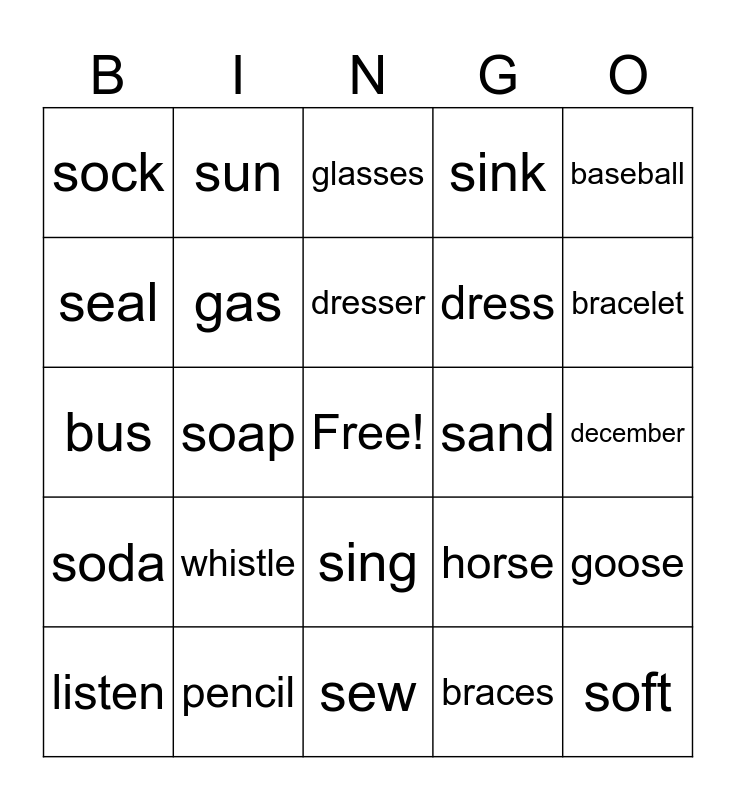 This bingo card has a free space and 24 words: whistle, pencil, dresser, listen, baseball, sock, seal, sun, sand, sing, dress, bus, horse, goose, gas, braces, december, glasses, bracelet, soap, soft, soda, sink and sew.