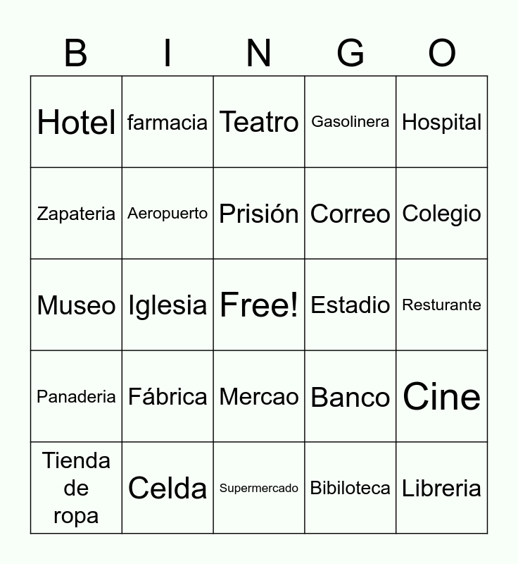 This bingo card has a free space and 24 words: Fábrica, Celda, Prisión, Tienda de ropa, Hospital, Hotel, Zapateria, farmacia, Estadio, Mercao, Correo, Museo, Banco, Cine, Aeropuerto, Bibiloteca, Resturante, Teatro, Colegio, Iglesia, Libreria, Panaderia, Gasolinera and Supermercado.