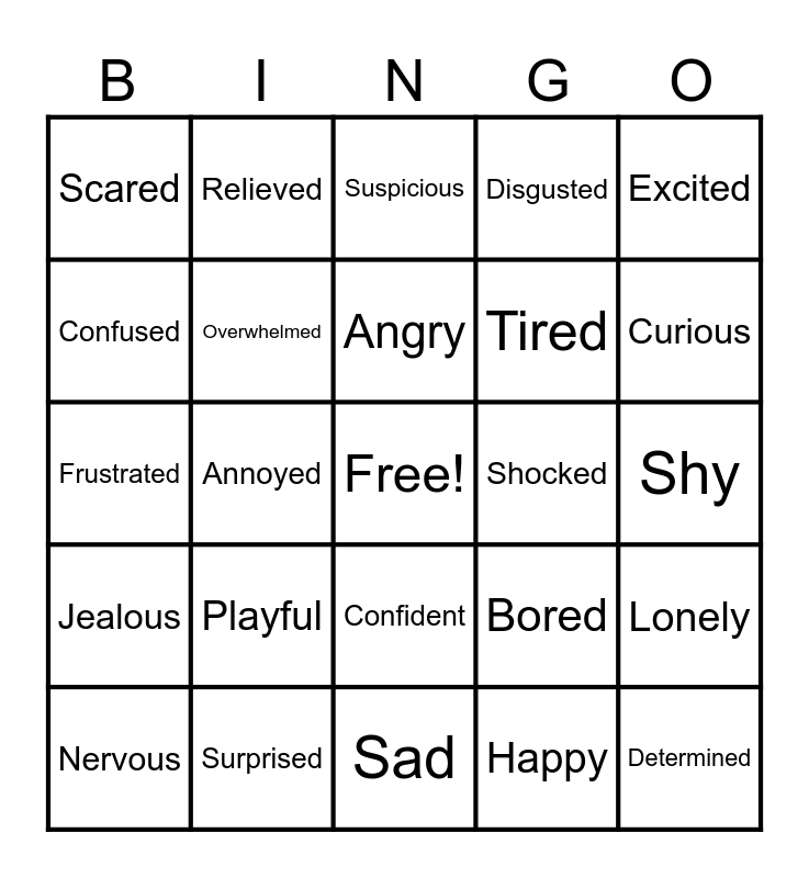 This bingo card has a free space and 26 words: Confident, Happy, Angry, Surprised, Excited, Scared, Confused, Relieved, Shy, Bored, Tired, Frustrated, Lonely, Nervous, Annoyed, Embarrassed, Disgusted, Jealous, Suspicious, Determined, Curious, Sad, Shocked, Playful, Overwhelmed and Afraid.