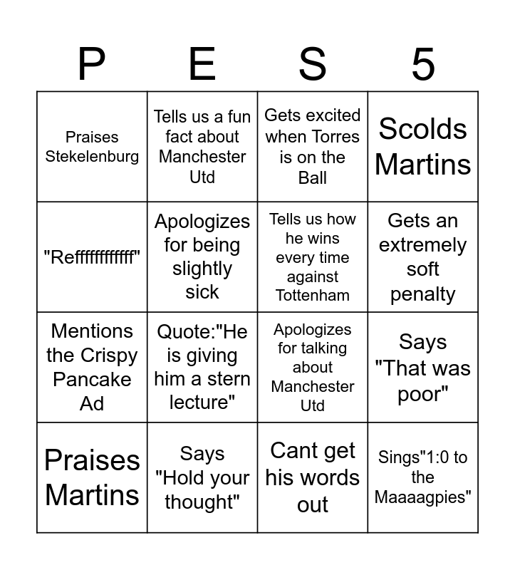 This bingo card has 16 words: Says "Hold your thought", Says "That was poor", Gets excited when Torres is on the Ball, Praises Stekelenburg, Mentions the Crispy Pancake Ad, Tells us a fun fact about Manchester Utd, Apologizes for talking about Manchester Utd, Cant get his words out, "Reffffffffffff", Apologizes for being slightly sick, Praises Martins, Scolds Martins, Quote:"He is giving him a stern lecture", Gets an extremely soft penalty, Tells us how he wins every time against Tottenham and Sings"1:0 to the Maaaagpies".