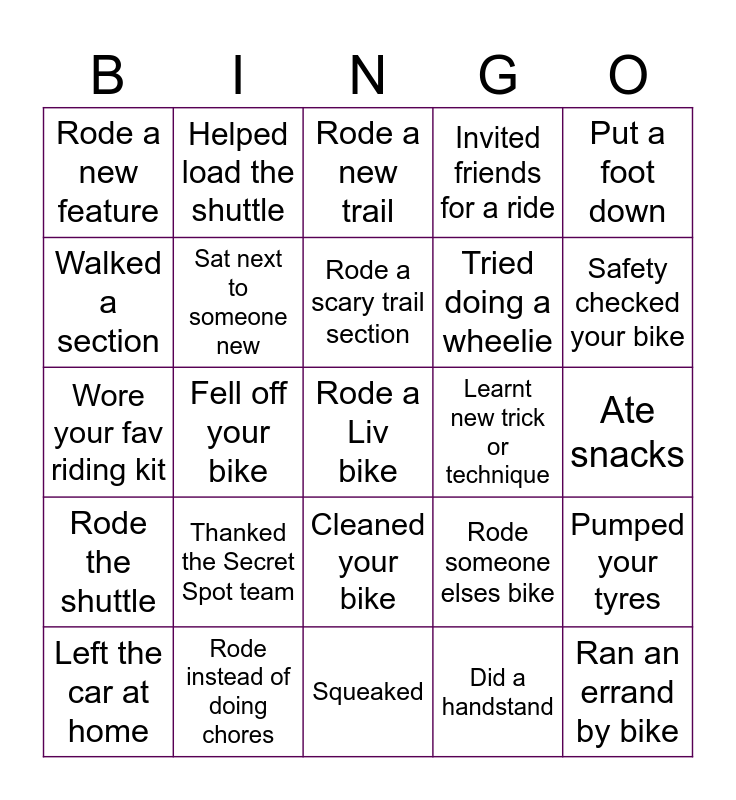 This bingo card has 31 words: Squeaked, Did a skid, Fell off your bike, Picked up some rubbish, Rode a new feature, Rode a new trail, Sat next to someone new, Rode someone elses bike, Learnt new trick or technique, Did a handstand, Ate snacks, Rode a Liv bike, Ran an errand by bike, Lubed your chain, Safety checked your bike, Took a photo, Pumped your tyres, Thanked the Secret Spot team, Rode the shuttle, Cleaned your bike, Put a foot down, Taught someone a new skill, Left the car at home, Helped load the shuttle, Tried doing a wheelie, Walked a section, Invited friends for a ride, Wore your fav riding kit, Rode instead of doing chores, Rode a scary trail section and Fear braked.